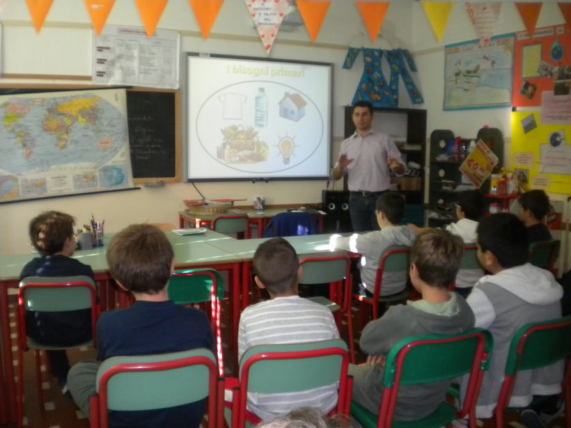 Venerdì 27 Novembre siamo stati ospiti della scuola Primaria di Madonna, una realtà scolastica che ci ha colpito per l’ampio spazio che dedica, nei suoi programmi formativi, alle tematiche ambientali. Le aule tappezzate di cartelloni, lavori e disegni fatti dai ragazzi, sono una bellissima testimonianza di questo impegno. Proprio dall’osservazione di uno di questi cartelloni che trattava di alimentazione, abbiamo introdotto il percorso Cibo, ambiente e foreste. In che modo la richiesta di cibo al giorno d’oggi può modificare l’ambiente che ci circonda? In che modo lo ha fatto nei secoli passati? Quali popoli sono scomparsi a causa della cattiva amministrazione delle loro foreste? Quali cibi provenienti da paesi lontani hanno cambiato i gusti dei popoli europei? Abbiamo cercato di rispondere a queste domande, guardando al passato della nostra civiltà ed immaginando un futuro che possa essere sostenibile per una popolazione mondiale, mai così numerosa. Gli studenti sono stati degli ottimi interlocutori, hanno espresso le loro opinioni e rivolto al formatore domande sempre pertinenti.